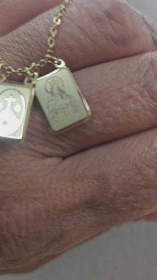 ¡Lleva contigo la protección de la Virgen del Carmen con nuestra hermosa gargantilla escapulario! Hecha de acero en color dorado y de cuarenta centímetros de largo, cuenta con dos pequeñas medallitas que te mantendrán conectado/a a tu fe y brindarán una elegante apariencia. ¡Haz que tu moda sea más significativa!